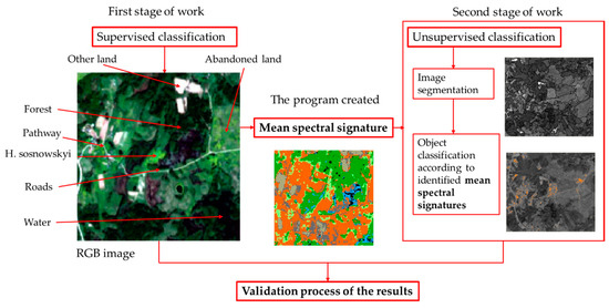 H. sosnowskyi (Heracleum sosnowskyi) is a plant that is widespread both in Lithuania and other countries and causes abundant problems. The damage caused by the population of the plant is many-sided: it menaces the biodiversity of the land, poses risk to human health, and causes considerable economic losses. In order to find effective and complex measures against this invasive plant, it is very important to identify places and areas where H. sosnowskyi grows, carry out a detailed analysis, and monitor its spread to avoid leaving this process to chance. In this paper, the remote sensing methodology was proposed to identify territories covered with H. sosnowskyi plants (land classification). Two categories of land cover classification were used: supervised (human-guided) and unsupervised (calculated by software). In the application of the supervised method, the average wavelength of the spectrum of H. sosnowskyi was calculated for the classification of the RGB image and according to this, the unsupervised classification by the program was accomplished. The combination of both classification methods, performed in steps, allowed obtaining better results than using one. The application of authors’ proposed methodology was demonstrated in a Lithuanian case study discussed in this paper.