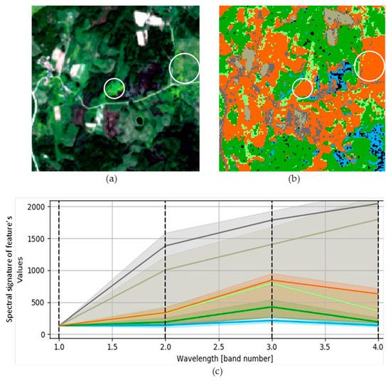 Results of classification in the 10 m RGB image: (a) RGB image; (b) classification result of the land cover classes: abandoned land (light green color), forest (dark green color), agriculture land (light grey color), pathway (black color), H. sosnowskyi (inside of blue circle–orange color), road (dark grey color), and water (blue color); (c) statistics: spectral signature of features.