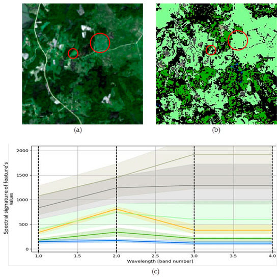 Results of classification in the 20 m RGB images: (a) RGB image; (b) classification result of the land cover classes: abandoned land (light green color), forest (dark green color), other land (light grey color), pathway (black color), H. sosnowskyi (inside of red circle) merge with abandoned land (light green color), road (dark grey color), and water (blue color); (c) statistics: spectral signature of features.