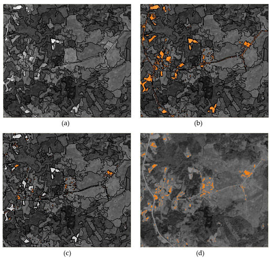 Results of classification: (a) segmentation (the smallest segment was 100 pixels); (b) classification of H. sosnowskyi value 845.9 (orange color in the map); (c) split other land classes classification value 950 (grey color in the map); (d) merged objects classification result (orange color feature of H. sosnowskyi).