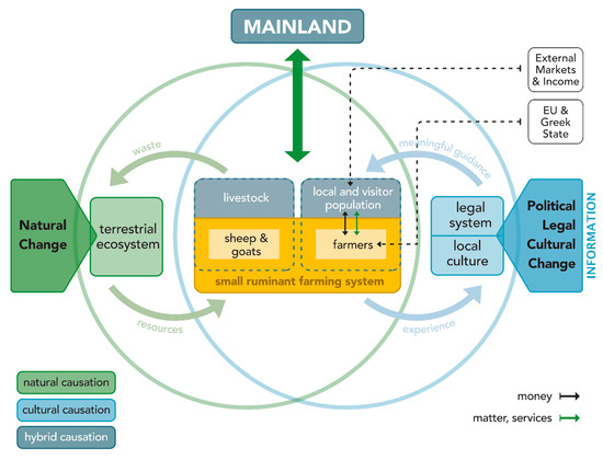 For the present study, we defined the system of investigation as the small ruminant farming system (SRFS) and its most relevant socio-economic and ecological relations, shown in Figure 1. The green circle represents the natural, and the blue circle, the cultural sphere of causation, with the livestock and human population in the overlapping part. The SRFS is defined as the small ruminant population (sheep and goats), its metabolic requirements, its material output in terms of products, the small ruminant farmers and their monetary economy. Terrestrial ecosystems provide the net primary production (NPP) consumed by small ruminants. The SRFS exchanges goods and money with the local population, including visitors. The political, legal and cultural framework is represented by rules and regulations of the Greek state, and the EU and local traditions. The EU provides agricultural subsidies through the Common Agricultural Policy (CAP), and the Greek state pays pensions to retired farmers. The local and visitor population receive money from external markets and through income from external sources (e.g., work or pensions). Wastes are not explicitly assessed in this study, but they are a relevant factor, especially regarding slaughtering residues and emissions.