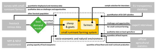 The present study is part of a long-term research project on Samothrace, beginning in 2008. Thus, we were able to build upon previous research efforts and use data from various sources. The aim of covering environmental, social and economic factors resulted in the need to utilize a mixed methods approach [20]. As indicated by the grey boxes shown in Figure 2, we integrate quantitative and qualitative data from a survey with 23 small ruminant farmers, qualitative data from 12 expert interviews, public statistical data, and data from previous research on land cover dynamics [24,27]. For the assessment of biophysical flows, we utilize a bottom-up or stock-driven approach, to assess the biomass consumption of the SRFS on the island. Detailed documentation can be found in the Supplementary Data (SD) and Information (SI) file.