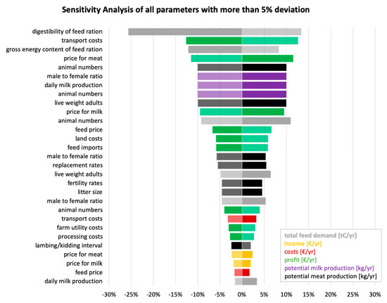 The sensitivity analysis was applied to biophysical and monetary parameters. 23 input parameters were tested with a freely chosen ±10% factor and their effect on the 6 output variables, total feed demand [tC/year], sustainable grazed biomass [t/year], revenue [€/year], costs [€/year], income [€/year], potential milk production [kg/year], and potential meat production [kg/year] evaluated. Figure 3 shows the deviation of output variables with higher values than ±1.5%. The different colors represent the 6 different output variables in regard to the ±10% deviation of the input variables. The left side represents minus 10%, the right side plus 10% deviation of input variables. Transparent colors indicate a minus deviation, and full color bars represent a plus deviation of output variables. For a detailed description of the uncertainty evaluation of model input parameters see Supplementary Information: Section 6.