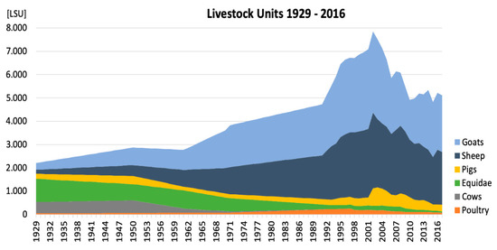 Figure 4 shows the increasing significance of small ruminants in relation to other livestock species on the island from 1929 to 2016. Total livestock is expressed in livestock units (LSU), which express the nutritional requirements of each species. In 1929, the island had 490 [LSU] cows, 430 [LSU] pigs, 1250 [LSU] Equidae (horses, mules and donkeys), 3026 [LSU] poultry, 1672 [LSU] sheep and 2892 [LSU] goats. Small ruminants represented only 21% of all [LSU] in 1929, compared to cows (22%), pigs (10%), Equidae (45%) and poultry (2%). In 2016, small ruminants represented 93% of all LSU (2276 [LSU] sheep; 2428 [LSU] goats), while cows are reduced to 0%, pigs to 5% (277 [LSU]), Equidae to 1% (56 [LSU]) and poultry remained at 2% (77 [LSU]). Total [LSU] for small ruminants increased from 456 in 1929 to 4478 in 1992 before reaching their peak at 6735 in 2002, declining to values between 4100 and 4800 thereafter. For annual population numbers and [LSU] refer to Supplementary Data: Figure S4.