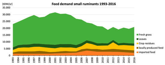 Figure 5 shows the annual feed demand of the small ruminant population in 5 categories: imported feed (orange), locally produced feed (dark yellow), crop residues (yellow), leaves (dark green) and fresh grass (green). Total feed demand was 23,000 tDM/year in 1993, increased to 31,600 tDM/year in 2001, and declined to values between 19,000 and 21,000 tDM/year thereafter. Annual values are provided in Supplementary Data: Figure S5.