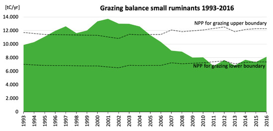 Grazing in local ecosystems accounts for the feed demand categories of fresh grass, leaves and crop residues (Figure 6). In 1993, the grazing demand of the small ruminant population was 9900 tC/year, increasing to 13,700 tC/year in 2001, and declining to values between 7000 and 8000 tC/year thereafter. Herein, we use two boundaries of the net primary production of biomass available for grazing (NPP) to assess the potential overgrazing and therefore, degradation of local ecosystems (see Section 2.3.2). We found that the upper grazing boundary was exceeded for at least 10 years between 1995 and 2005, while the lower boundary was exceeded for almost the entire period.