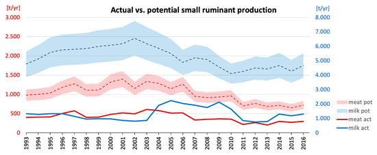 Actual vs. potential production of milk and meat from 1993 to 2016.