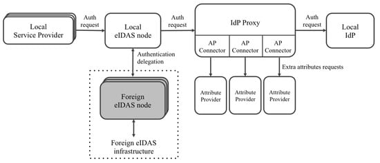 Thanks to the proposed extension of the eIDAS specification, service providers can make a request to an eIDAS node for retrieving the users’ academic attributes included in the proposed list. However, IdPs used by Member States to authenticate citizens in the eIDAS network typically provide only personal and legal attributes. Therefore, when the eIDAS node of the users’ country of origin makes an authentication request to the corresponding national IdP, this IdP will respond including only the MDS attributes. In order to enrich the users’ profile with academic attributes, third-party attribute providers must be consulted and hence included in the authentication flow. With the aim of achieving this objective, we propose to make use of a proxy between the eIDAS nodes and the IdPs, which will be in charge of requesting the extra attributes to the attribute providers.