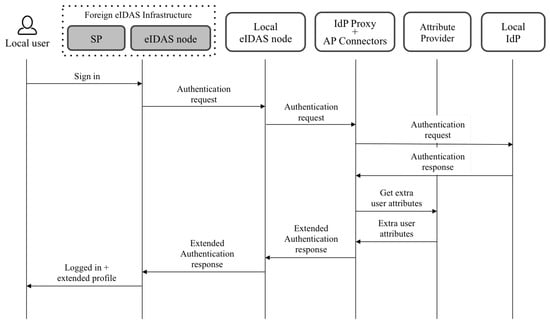 Lastly, Figure 4 shows the authentication flow when a local user accesses an SP deployed in a foreign eIDAS infrastructure. In this case, when the foreign eIDAS node redirects the request to the local one, the authentication request sent to the Local IdP is intercepted by the IdP Proxy. The IdP Proxy analyzes the requested attributes and temporally saves a list with their keys. After authenticating the user in the Local IdP, the IdP Proxy calculates the difference between the list of attributes previously saved and the ones received in the authentication response. If extra attributes are required and some of the available APs provide them, the corresponding AP Connectors send a request to retrieve them. If any extra attribute is provided, the corresponding AP Connector parses it to the required format and the IdP Proxy includes the result in the authentication response. Once all extra attributes have been included in the authentication response, the IdP Proxy sends this response back to the local eIDAS node, which in turn forwards it to the foreign eIDAS node that finally sends it to the SP.