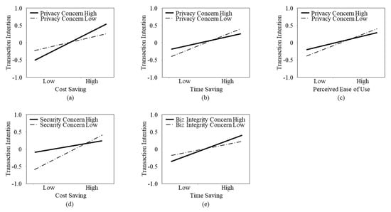 According to the Model 6 results, all the effects associated with three independent variables were supported. When the moderating effects of concerns for e-commerce were controlled at Model 6, the direct effect of cost saving on transaction intention was found to be significant (b = 0.625, p < 0.05), supporting H1. Saving more time positively influenced the intention to purchase via an online open market (b = 0.473, p < 0.05), indicating that consumers expect to save more time by shopping in the online open market than in the offline stores. Conversely, wasting time or spending more time in shopping adversely impacted purchase intention. All these results supported H2. Perceived ease of use was also found to significantly influence transaction intention (b = 0.465, p < 0.05), supporting H3.