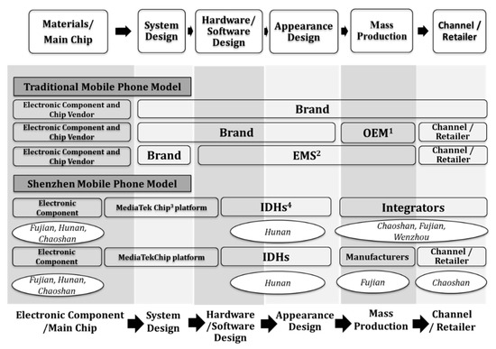 A comparison of the value chain in production (Source: authors modify from [79]). Note: 1: OEM: original equipment manufacturing. 2: EMS: electronic manufacturing services. 3: MediaTek had been the major chip provider of Shenzhen Mobile Phones, and increased to 90 percent in 2010. 4: IDHs: independent design houses.