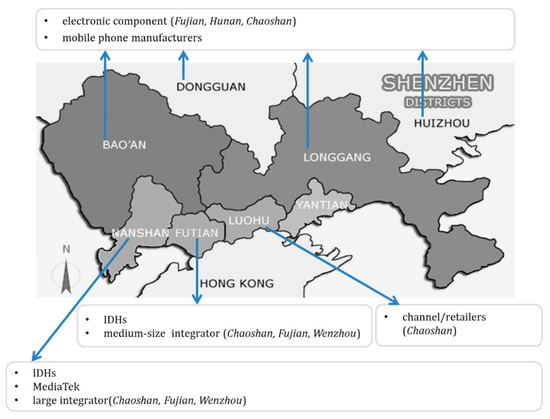 In the early 2000s, a mobile phone required the following to be legal in China: a network access code, phone model number, scrambling code, International Mobile Equipment Identity (IMEI) code, and serial number [67]. Any mobile phone without these licensed codes was illegal and called a “black mobile phone” (or “bandit mobile phone” after 2005). Illegal mobile phones were mainly produced by opportunistic manufacturers based in Shenzhen District where they evaded government management. Shenzhen District was the first special economic zone (SEZ) in mainland China. It provides political support and advantages to attract firms’ investment, such as special economic regulations and policies, infrastructure support, and tax credits. For the past four decades, such advantages have successfully attracted several foreign firms, including Hong Kong companies, to SEZs, together with Chinese state-owned enterprises, domestic high-tech private companies, and Taiwanese high-tech firms. Such extensive investment allowed Shenzhen District to grow rapidly and form a complete electronic supply chain [68]. Having previously supported MP3s and DVDs, this chain began to provide electronic components for cellular phones.