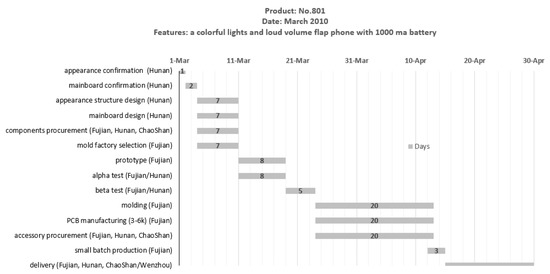 Due to the homogeneity of the sanctioned ethnic groups in the Shenzhen mobile phone industry, a high degree of cooperation in the division of labor enables the efficient development of functional products. On average, a traditional mobile phone manufacturer such as Nokia, Motorola, or Samsung takes approximately 1 year to fully develop a new mobile phone, and can gauge the market reaction in 3–6 months. To evaluate how the Shenzhen mobile phone industry compares, we consider the time-to-market development schedule of a mobile feature phone with colorful lights, a loud volume flap, and a 1000 ma battery. Through the efficient coordination of homogeneous sanctioned ethnic groups, the process of developing the product’s appearance and confirming the mainboard takes just 2 days; the process of structure, mainboard design, components procurement, and mold factory selection takes 7 days; creating the prototype and conducting the alpha test takes 8 days; conducting the beta test takes 5 days; molding, PCB manufacturing (3–6 k), and accessory procurement takes 20 days; and, finally, small batch production and delivery takes 3 days. Overall, then, the product development schedule of such a feature phone in the Shenzhen mobile phone industry is only 61 days (see Figure 4). Such an efficient coordination of Shenzhen mobile phone model is followed by a prior observation of Lee and Hung [29], which suggested that those informal entrepreneurs with higher social trust built on similar sanctioned ethnic groups who come up with novel feature phone ideas, build new customer bases, and raise the first working capital could all trigger a new product cycle.
