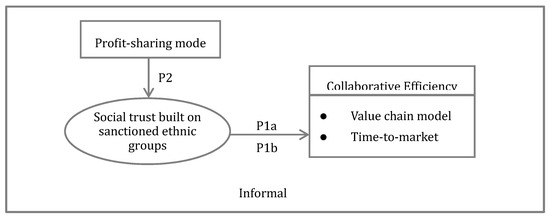 First, we reveal that different sanctioned ethnic groups operating in the value chain to build up the Shenzhen mobile phone industry that performs in order to deliver the valuable feature phones. These various ethnic groups vary in different operation activities in the value chain of Shenzhen mobile phone industries. For example, Chaoshan people were involved in electronic components, retail, and integration, Hunan people mainly focused on IDHs of feature phones, and Fujian and Wenzhou people were two ethnic groups to operate in integrators of Shenzhen mobile phones. These four types of informal entrepreneurs with high level of social trust built on homogeneous sanctioned ethnic groups collaboratively foster an efficient integration of the value chain in the Shenzhen mobile phone industry. These findings are consistent with those of Lee and Hung [29] who confirmed that Shenzhen mobile phone industries appeared when those different sanctioned ethnic groups began to seek to cooperate and exchange their own operation activities from outside partners. Such collective cooperation and activities exchange due to social trust built on homogeneous sanctioned ethnic groups enable these informal entrepreneurs to use their open innovation strategies [70]. Moreover, against the background of illegal transaction of Shenzhen mobile phone industries, social trust is necessary required when perceived opportunism is higher [60]. Brockman et al., [19] confirmed that firms in the high-social-trust context are likely to produce a higher level of open innovation. Greater social trust increases the higher collaborative efficiency by reducing opportunism and ensures predictable transaction during external cooperation [23]. The high degree of interaction in the trust-based situations can make an effective way of collaboration [59]. Therefore, we summarize our agreements in the form of a research proposition (also see Figure 5).