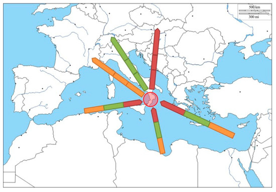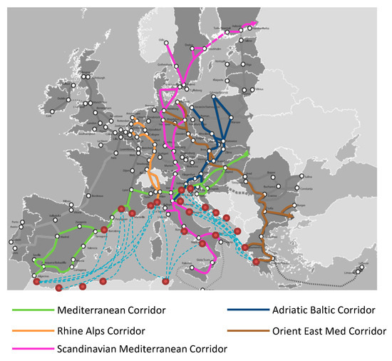 It should also be noted that most of the Mediterranean Ro-Ro and Ro-Pax (freight and passengers) routes (both on the western and eastern sides) climb Italy, consolidating the gaps in the TEN-T (Trans European Transport Network) corridors (Figure 2); this applies to the west-east corridor, along the bridge-Balkans Barcelona–Italy; to the double Adriatic corridor that connects Italy with Greece (Trieste, Venice, Ancona, Bari, and Brindisi all have a historical link with Igoumenitsa–Patras) and Turkey and fall within the countries of the Middle East; to the Tyrrhenian connections with the North African countries; and to the connections between Italy, Malta, Corsica, and Albania (the Bari-Durres line is historical).