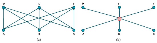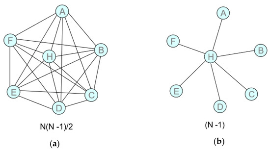 The term H&S means a network scheme in which there is a central node (hub) where most of the displacements are concentrated, connected to a set of peripheral nodes through a set of rays (spokes). This model has considerable advantages over a solution with point to point (P2P) connections between all the nodes of the network. For example, if it is necessary to connect six different nodes, the total number of P2P connections would be equal to 42 (Figure 3a); with an H&S approach, in which an intermediate hub node is appropriately inserted, the number of connections would drop to six (Figure 3b). In general, N is the number of the connected nodes and the number of links is N·(N-1)/2 for a P2P network, but only (N-1) for a H&S network.