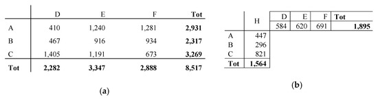 It is assumed that ports A, B, and C are located on the southern shore of the Mediterranean Sea (Algeria, Tunisia, and Egypt), while ports D, E, and F are on the northern shore (France, Italy, and Greece). In the H&S network configuration, the hub (H) was considered in a barycentric position (Calabria region). In the first case, the network consists of six nodes and nine links, while in the second case the number of nodes is equal to seven and the number of links is reduced to six.