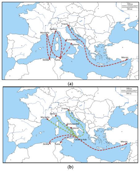 A further analysis was carried out with reference to the current status considering some of the maritime connections operating between the southern and northern shores of the Mediterranean (Figure 8), assuming an H&S network as the scenario configuration.