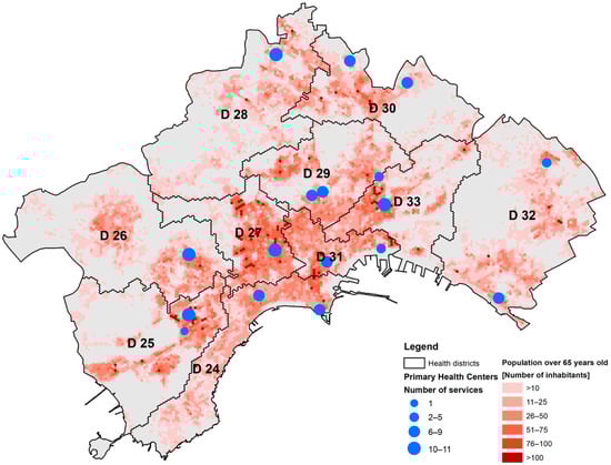 The proposed GIS-based procedure was applied to the city of Naples to evaluate the urban accessibility of the elderly to public primary health services: Table 3 shows the number of available surgeries within each district. We selected this case study because it is a representative example of a complex southern European city with high population density, non-uniform urban structure, and the absence of a specific plan to satisfy the elderly people’s needs.