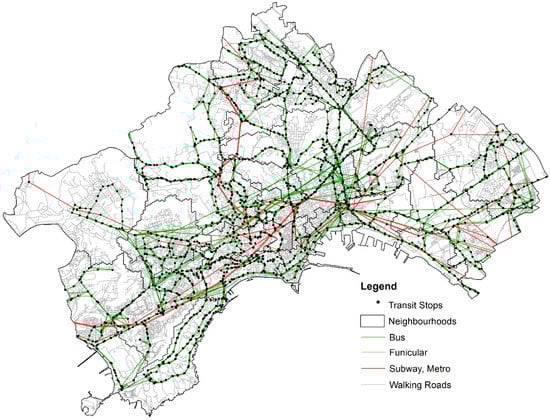 The methodology is based on a multimodal transport network, which is the combination of a pedestrian and public transport graphs. The pedestrian graph is composed of walkable roads and was obtained by removing non-walkable streets from the network, such as highways. Every link of the pedestrian graph was considered equally walkable: further features, such as the presence of pavement, green areas, benches, etc., could be added to assess the quality of urban environment from the elderly perspective. The public transit network is based on both geographic and alphanumeric information and the general transit feed specification (GTFS) data. GTFS data are a collection of at least 6 and up to 13 files concerning transit agency, routes, bus stops, schedules, etc. Due to GIS tools, GTFS data can be added to a network feature to create the public transit graph, which is composed of nodes (bus and metro stops), links (routes), and connectors to the walkable roads. The latter do not have a physical correspondence, but they are dummy elements that simulate the spatial and temporal discontinuity of public transport modes. The multimodal network is associated to a transit network dataset, which defines variables and limits (walking speeds, speed of bus and metro, etc.), useful for model travel times.