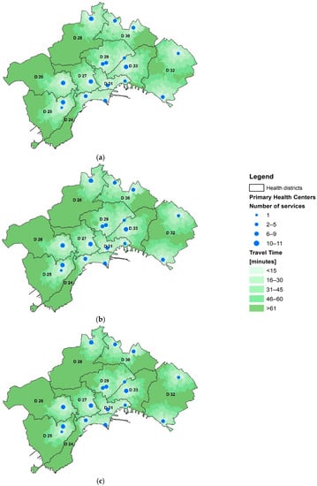Travel time to primary health centers for three different groups of elderly: (a) 65–69, (b) 70–74, and (c) over 75 years.