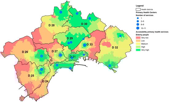 Figure 4 highlights the overall accessibility levels experienced by the elderly inhabitants of Naples. Information portrayed in this map could make a valuable contribution in supporting the decision-making processes associated with any attempts to locally restructure services with the aim of improving the spatial allocation of primary care resources. The methodology is based on the assumption that primary health buildings’ locations is a significant consideration as well as their resources, in terms of physicians, number of surgeries, and operating hours, which all contribute to these results.