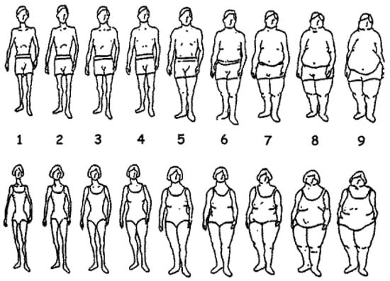 To assess self and ideal body sizes, the Stunkard Figure Rating Scale (Figure 1) was used. The Stunkard Scale consists of nine silhouette figures that increase in size from very thin (a value of 1) to very obese (a value of 9) []. Self-body size is the number of the figure selected by subjects in response to the prompt “Choose the figure that reflects how you think you look”. Ideal body size is the number of the figure chosen in response to the prompt “Choose your ideal figure”. For self-body size and ideal body size, dummy variables were created for the underweight, normal weight, overweight, and obese body size categories. This scale has shown good validity and reliability []. Later, body size satisfaction was calculated. This value is defined as the difference between one’s perceived self-body size and perceived ideal body size.