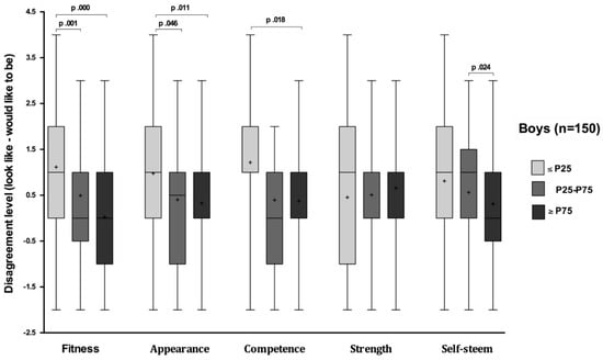 The results revealed that there were significant differences in four factors of self-concept between the three groups created in boys (Figure 1). Specifically, fitness and appearance showed significant differences in P25 regarding to P25–75 (pfitness = 0.001; pappearance = 0.046) and P75 (pfitness = <0.001; pappearance = 0.011). Furthermore, competence showed significant difference among P25 and P75 (p = 0.018) groups. The P25 group always had high levels in self-concept with respect to the other group. In contrast, self-esteem only showed significant differences between P25–75 and P75 groups (p = 0.024), with higher values in the first group. Finally, there was no difference in strength between Stunkard disagreement groups.