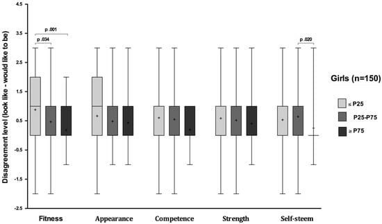In relation to the differences in the perception of Stunkard disagreement in girls, only two factors of self-concept presented significant differences between Stunkard disagreement groups (Figure 2 and Figure 3). Fitness showed significant differences in P25 regarding to P25–75 (p = 0.034) and P75 (p < 0.001) and self-esteem between P25–75 and P75 groups (p = 0.020). In both cases, groups with less Stunkard disagreement had higher values in self-concepts factors.