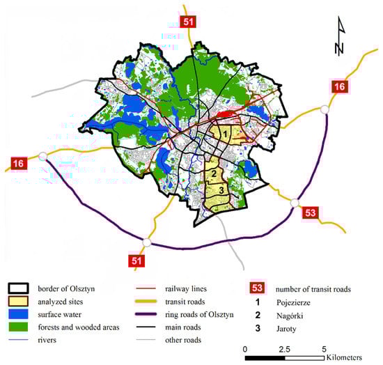 Olsztyn has 23 districts which constitute auxiliary territorial units of the Olsztyn municipality (Local Government Act of 1990). The study was conducted in three residential districts within the administrative boundaries of Olsztyn: Pojezierze, Jaroty and Nagórki (see Figure 2). The analyzed districts are composed mostly of apartment buildings. Nagórki is situated far from traffic routes, and residential activity is the main source of local noise. The district is intersected by local roads as well as municipal roads that are not a part of the national road network. In contrast, Jaroty is intersected by a regional road with high levels of traffic, including tramway traffic, as well as residential and local roads. This part of Olsztyn is exposed to high levels of traffic noise. Pojezierze is intersected by a major trunk road, and heavy-duty vehicles transiting Olsztyn in the direction of Poland’s northern border pass in the direct vicinity of residential buildings. The remaining roads in Pojezierze are municipal and residential roads.