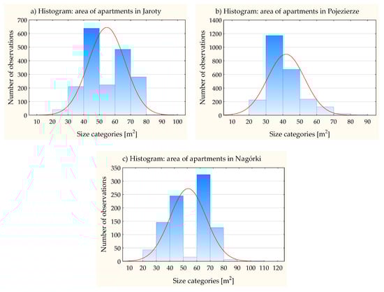 Histograms depicting the distribution of apartments in different size categories in each residential district were developed to create a homogeneous sample (Figure 4). In Jaroty and Pojezierze, the highest number of transactions involved apartments with a floor area of 30–40 m2; therefore, the number of the analyzed transactions was narrowed down to 639 in Jaroty and 1170 in Pojezierze. In Nagórki, most of the traded apartments had an area of 60–70 m2, and 337 transactions in this size category were analyzed.