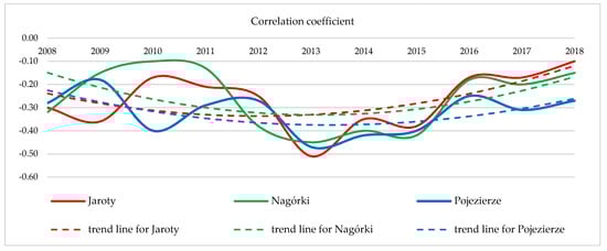 The trend lines presented in Figure 7 based on Table 4 data confirm that infrastructure development projects have improved acoustic comfort in Olsztyn. The values of correlation coefficients were stabilized at a low level after the completion of the major infrastructure projects in the city. These parameters ranged from −0.10 to −0.31 in 2017, and from −0.15 to −0.27 in 2018, which indicates that the influence of traffic noise on apartment prices has steadily decreased. Traffic noise exerted the greatest impact on apartment prices in Pojezierze, which could be attributed to the fact that this district was most burdened with the noise generated by transit traffic. Pojezierze was characterized by the highest values of the correlation coefficient during the entire study (Table 3), and annual values were stabilized above −0.25 in the last three years. In Jaroty and Nagórki, the values of the correlation coefficient have been decreasing steadily since 2015, which suggests that traffic noise is a less significant driver of apartment prices.