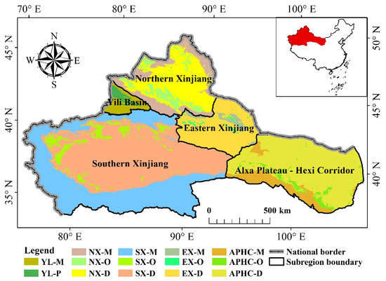 The northwestern arid area of China (34°20′10″ N ~ 49°10′30″ N, 73°33′27″E ~ 106°50′34″ E) lies to the north of the Kunlun Mountains–Qilian Mountains terrain belt and to the west of the Helan Mountains, with an area of 235 × 104 km2, around one quarter the size of China. This arid area includes the whole area of the Xinjiang Uygur Autonomous Region, the Alxa plateau of the Inner Mongolia Autonomous Region, and the Hexi corridor (i.e., towards the west of the Yellow River) of Gansu province, with a total of 134 counties. The study area has a temperate continental climate, except for high-altitude localities with highland mountain climates. Here, the strong evapotranspiration capability is 8~10 times as great as its extremely scarce precipitation (230 mm). Mountain ranges (M) surround the two basins, and extensive deserts (D) are interwoven with scattered oases (O), a unique type of topography denoted a mountain–oasis–desert system (MODS). Referring to the research of Wang et al. [22], our study divides the northwestern arid land into five large parts: northern Xinjiang (NX), southern Xinjiang (SX), the Yili basin (YL), eastern Xinjiang (EX), and the Alxa Plateau–Hexi Corridor area (APHC). Furthermore, mountains, oases, and deserts are extracted for each area based on the elevation range and land use type. Here, Yili is only zoned into mountains and plains. After these partitions, the study area is divided again into 14 sub-regions (Figure 1).