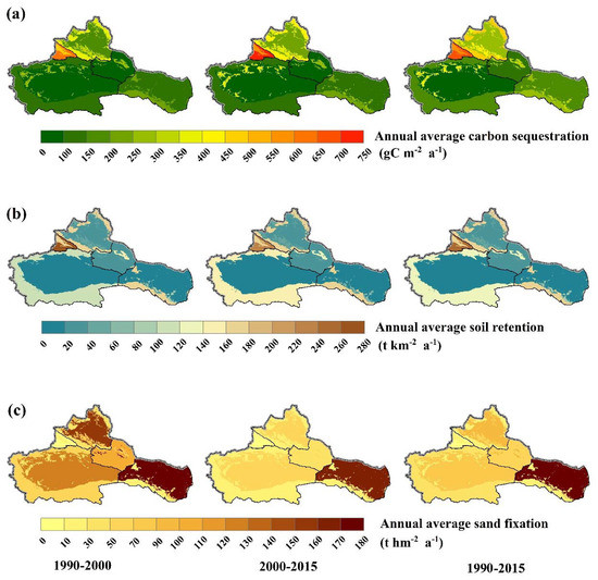The ecosystems services of NW from 1990 to 2015 had an average of 159.563 gC m−2 a−1, 70.077 t km−2 a−1, and 80.256 t hm−2 a−1 in annual carbon sequestration, soil retention, and sand fixation, respectively. The spatial patterns of the ecosystem services during the two sub-periods (i.e., before 2000 and after 2000) and over the whole study period are shown in Figure 2. Carbon sequestration during these time periods represented a similar spatial pattern (Figure 2a). Among all MODS sub-regions, the Yili mountains had the highest carbon sequestration regardless of time period (before 2000: 559.567 gC m−2 a−1; after 2000: 678.577 gC m−2 a−1; 1990–2015: 638.300 gC m−2 a−1), and the southern Xinjiang deserts always had the lowest carbon sequestration (before 2000:83.446 gC m−2 a−1; after 2000: 76.269 gC m−2 a−1; 1990–2015:77.771 gC m−2 a−1). Obviously, the northern Xinjiang oasis and mountains and southern Xinjiang oasis had higher carbon sequestration than the other MODS sub-regions of NW. Soil retention distinctively varied across the whole arid area (Figure 2b). Soil retention during these three periods had similar spatial patterns. As in the ranking of carbon sequestration, among the 14 sub-regions, the Yili mountains experienced the highest soil retention (1990–2000: 265.306 t km−2 a−1; 2000–2015: 237.099 t km−2 a−1; 1990–2015: 242.067 t km−2 a−1). However, the southern Xinjiang oasis and its desert, as well as the Alxa Plateau–Hexi Corridor desert, had the lowest soil retention. Besides being the highest and the lowest areas, the northern Xinjiang mountains, Alxa Plateau-Hexi Corridor mountains, and Yili plains experienced higher soil retention. In a word, most mountains had higher soil retention than deserts and oases. The boundary between the soil retention of the desert and that of the oasis, therefore, seems to disappear. As shown in Figure 2c, the highest value of the sand fixation was concentrated on the Alxa Plateau–Hexi Corridor in all periods (before 2000: 150.805 t hm−2 a−1; after 2000: 139.966 t hm−2 a−1; 1990–2015: 141.685 t hm−2 a−1). Before 2000, the spatial distribution of sand fixation displayed an obvious difference. At this time, sand fixation of the northern Xinjiang deserts had a higher magnitude (159.154 t hm−2 a−1). For the other two time periods, there was little spatial difference in the sand fixation of Xinjiang.