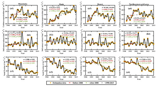 Temporal change trends of the ESs during the three periods (i.e., before 2000, after 2000, and 1990–2015) for the MODS of the northwestern arid area. (a1–a3) Carbon sequestration, (b1–b3) soil retention, and (c1–c3) sand fixation.