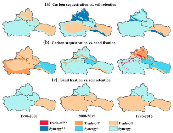 The interactions determined by regional average correlation coefficients are shown in Figure 4, alongside those that were checked according to significance (p < 0.05). The relationships between carbon sequestration and soil retention, carbon sequestration and sand fixation, and sand fixation and soil retention were classified into six categories: trade-off** (r < 0, p ≤ 0.01), synergy** (r > 0, p ≤ 0.01), trade-off*(r < 0, 0.01 < p ≤ 0.05), synergy* (r > 0, 0.01 < p ≤ 0.05), trade-off (r < 0, p > 0.05), and synergy (r > 0, p > 0.05). These trade-offs and synergies (Figure 4) have great spatial and temporal heterogeneity throughout the whole NW. From the aspect of the relationship between carbon sequestration and soil retention, during 1990–2015, synergies were present in all sub-regions of NW, except APHC-D, with a strong trade-off (r < 0, p ≤ 0.05) (Figure 4a). Before 2000, weak synergies (r > 0, p > 0.05) were mostly spread across the whole arid area, with the exception of weak trade-offs (r < 0, p > 0.05) in the NX-D, EX-O, and APHC-D. After 2000, only SX-D and APHC-D had a weak trade-off relationship, while the other sub-regions established synergistic relationships between carbon sequestration and soil retention, which presented all the strong synergies for the oases and the whole YL (r > 0, p ≤ 0.05). From the perspective of the relationship between carbon sequestration and sand fixation, during 1990–2015, trade-offs occurred in all oases (including YL-P), and the majority of these trade-offs (i.e., those at NX-O, SX-O, and EX-O) were strong. Except for the trade-off in NX-M, synergies covered all mountains. Before 2000, trade-offs were distributed across the whole NW, excluding APHC-D. Similar to the conditions in 1990–2015, after 2000, trade-offs between carbon sequestration and soil retention were present in all oases (including YL-P), but only EX-O was strong. Furthermore, strong synergies occupied all deserts (Figure 4b). Only a weak relationship was found between sand fixation and soil retention for all periods throughout the whole arid area. Additionally, the APHC-D, YL, and MODS of NX had a constant relationship. There were no highly distinctive spatial patterns among the mountains, oases, and deserts, but all five large regions had such patterns. Before 2000, weak trade-offs were mostly spread across the NW, except for APHC-D. Proceeding to the next stage, weak synergies expanded to EX-D, EX-O, the MODS of SX, and the MODS of APHC. Moreover, the after-2000 relationships seemed to control the relationships of each sub-region in 1990–2015 (Figure 4c).
