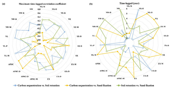 The corresponding correlation coefficients of carbon sequestration, soil retention, and sand fixation at each time-lag were calculated based on the principle of the time-lagged cross-correlation method. Then, the maximum time-lagged correlation coefficients were selected based on their significant linear relationships (p < 0.05), and their corresponding time-lags were regarded as the interaction time range among them. These results are illustrated by the radar charts (Figure 5). According to the study of Li Boyan et al. [17], the time trade-off is the maximum time-lagged correlation coefficient that is significant and less than 0, and its corresponding time is the trade-off time; the time synergy is the maximum time-lagged correlation coefficient that is significant and greater than 0, and its corresponding time is synergistic time.