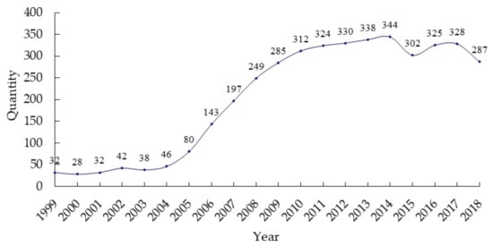 According to the changing track of the number of published research papers, three stages could be identified, namely, the steady development period, the rapid development stage, and the fluctuation decline phase. During the first stage (1999–2004), steady development period, research on energy utilization of agricultural waste was just getting started and the number of published papers was relatively small, averaging around 36. In the second stage (2004–2014), research on energy utilization of agricultural waste developed rapidly. The literature number increased by 80 in 2005, and many research results were emerging during this phase. The literature number reached a peak of 344 in 2014, and between 2004 and 2014, the average annually published literature amounted to 260. In the third stage (2014–2018), the fluctuation period, research on energy utilization of agricultural waste gradually matured with rich research results. Throughout this stage, the average annual published literature was 317, and the graph of these numbers had a characteristic “S”-shaped curve, presenting a significant change.