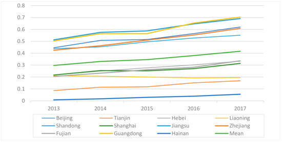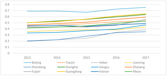 The comprehensive level of regional sustainable development in eastern China from 2013 to 2017 is shown in Figure 2. Except for Beijing, which continued to maintain a growth trend after a slight fluctuation in 2015, the remaining provinces and cities in the eastern region showed steady growth each year. Among them, Beijing, Guangdong, Shanghai, and Zhejiang have always been ahead of other provinces in the eastern region with obvious advantages, ranking first in the eastern region. The comprehensive sustainable development levels of Tianjin, Fujian, and Hainan are in the second echelon of the eastern region; the four provinces of Liaoning, Jiangsu, Shandong, and Hebei are in the third echelon of the eastern region with a large gap. It is worth mentioning that, as a province of the Yangtze River Delta, the comprehensive level of economic development of Jiangsu is third in the eastern region, just after Beijing and Shanghai. However, it is affected by the backwardness of social security and ecological environment levels, leading to Jiangsu’s comprehensive level of sustainable development being at the end of the eastern region (9th).
