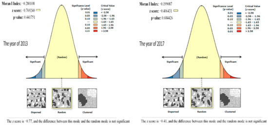In order to further explore the spatial correlation between the degree of coupling coordination of the sports industry and regional sustainable development in 11 provinces and cities in the eastern region, we used the ARCGIS 10.2 software to calculate the Moran index of the coupling coordination of the two major systems in 2013 and 2017, respectively: when it is larger than 0, it indicates that there is positive spatial correlation; when it is less than 0, it indicates that there is negative spatial correlation; when the value is close to 0, it indicates that the degree of spatial correlation is low or randomly distributed [50]. It can be seen from Figure 4 that the Moran indices in 2013 and 2017 were −0.2801 and −0.191, respectively, and the Z scores were −0.77 and −0.41, indicating that the pattern is randomly distributed in space and there is no spatial aggregation phenomenon. Therefore, the spillover effect of the coupling coordination of the two major systems of the 11 provinces and cities in the eastern region is insufficient, and there is a phenomenon of own development, and this phenomenon has persisted for a long time.