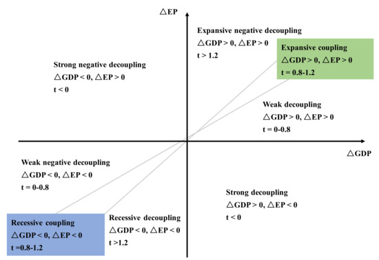 Referring to the Tapio decoupling framework [55], this study divides the degree of decoupling into three categories: decoupling, coupling and negative decoupling, and further refines it into eight indicators, as shown in Figure 2. Since Beijing’s GDP has maintained growth since 1992 (△GDP > 0), all possible decoupling states in Beijing are the four on the right side of the Y-axis in Figure 2 (namely expansive negative decoupling, expansive coupling, weak decoupling and strong decoupling). As a result, the decoupling state of Beijing can be uniquely determined.