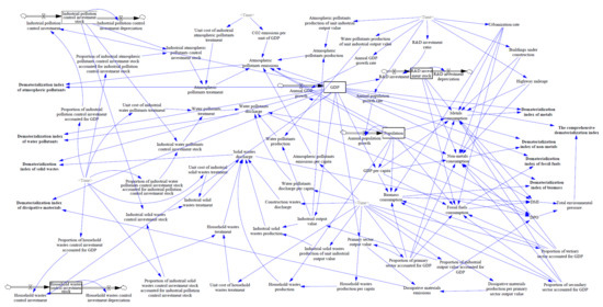 In different stages of economic development, the population structure and industrial patterns of each city are quite different. According to the specific characteristics of the city, feasible development measures should be proposed that are appropriate for the specific area. Therefore, on the basis of the evaluation of the dematerialization level, it is necessary to find the factors affecting the coordinated development of resource-economy-environment. By establishing the interaction between various influencing factors, the dematerialization level under different policies is simulated, and the specific development path of city dematerialization is formulated accordingly. The relationship between city economic development and resources and environment is characterized by nonlinearity, dynamics and complexity. System dynamics (SD) modelling is especially suitable for solving the problems of large-scale complex socio-economic system, which can fully reflect the internal nonlinear structure and dynamic changes of the system, and can simulate the city development trend under various constraints [1,32,33,34].