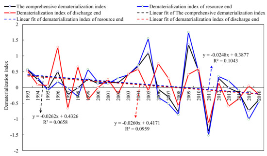 Figure 4 shows Beijing’s comprehensive dematerialization level, resource end and discharge end from 1993 to 2016. In this period, the trends of the comprehensive dematerialization level, the dematerialization index of resource end and the dematerialization index of discharge end showed a downward trend on average, which indicates that all three kinds of dematerialization levels have increased. In 2016, the comprehensive dematerialization index values, the dematerialization index values of resource end and the dematerialization index values of discharge end were −0.39, −0.46 and −0.21 respectively. According to the Tapio decoupling framework, their dematerialization levels were strong decoupling, which means that there is a clear separation between Beijing’s resources consumption, pollutants discharge and economic development, and the pressure of economic growth on resources and environment have decreased. During 1992–2016, the coefficient of variation (The coefficient of variation (CV) is defined as the ratio of the standard deviation to the mean, which is a statistic that measures the degree of variation in each observation. The coefficient of variation can eliminate the effect of different units and/or averages on the degree of variability of two or more data. (https://en.wikipedia.org/wiki/Coefficient_of_variation)) of the comprehensive dematerialization index values, the dematerialization index values of resource end and the dematerialization index values of discharge end were 6.40, 6.85 and 7.02 respectively. The dematerialization level of discharge end fluctuated the most, and the dematerialization level of comprehensive was the most stable. In the 24 years from 1993 to 2016, the years’ proportions of the comprehensive dematerialization level, the dematerialization index of resource end and the dematerialization index of discharge end reached strong decoupling were 45.8%, 41.7% and 41.7%, respectively. In general, the strong decoupling state is not yet dominant. Although Beijing’s dematerialization level is on the rise, the level of dematerialization is in the fluctuating state, and the ideal state of strong decoupling is not completely achieved. It is necessary to further break the coupling relationship between resources, environment and economic growth. Compared with the resource end, the discharge end is more sensitive to GDP growth. Therefore, there is greater potential to improve the dematerialization level of discharge end in the future.