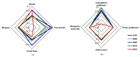 Figure 5 shows the contribution of each constituent material to the dematerialization index of DMI and DPO at different periods. It can be seen that the contribution of the biomass to DMI dematerialization index was relatively stable. The contribution degree of metals and fossil fuels also varies less, while the contribution of non-metals fluctuated greatly. In 2016, the contribution proportion of biomass and non-metals decreased by 1.64% and 144.98% compared with 1995. The non-metals consumption in Beijing was mainly concentrated in the construction sector. From 1992 to 2016, the development of the construction sector in Beijing was slow, the construction completion area increased by 26.48%, and the GDP increased by 8.73 times, indicating that the growth rate of non-metals consumption in the construction sector was slow. Compared with 2010, the decrease of non-metals consumption in 2016 resulted in the strong decoupling and the positive contribution to resource end dematerialization level. Non-metals have the greatest impact on the dematerialization index of resource end and play a positive role. From 1992 to 2016, the contribution of atmospheric pollutants to DPO’s dematerialization index was dominant, while the proportions of water pollutants, solid waste and dissipative materials to DPO’s dematerialization were small, mainly because atmospheric pollutants accounted for 87.07% of DPO on average. The average proportion of CO2 in atmospheric pollutants was 98.74%, and the CO2 emissions in the period 1992–2016 increased by 39.66%, which directly determined the weak decoupling trend of DPO. Therefore, from the perspective of contribution degree, to improve the dematerialization level of resource end, it is necessary to focus on non-metals consumption. For the discharge end, controlling CO2 emissions is the key.