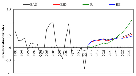 Compared with the historical trend, after 2017, the fluctuation of the comprehensive dematerialization index all would slow down and show a upward trend under four scenarios (see Figure 6). However, it would remain in the decoupling state (the decoupling index value is between −0.0085 and 1.08). During 2017–2024, under the IR scenario, the dematerialization level would be the best, but it would only reach the strong decoupling state in 2017. At this time, the dematerialization index value is –0.0085. The other three scenarios would all be in weak decoupling. In 2017, the dematerialization index under the IR scenario would drop by 103.86% compared with other scenarios. From 2017 to 2024, the advantage effect of dematerialization development under the IR scenario would gradually decrease, because the proportion of the tertiary sector accounted for GDP would reach 80.90% in 2017, and the proportion of technology investment in GDP would reach 7.07%. By 2025, the dematerialization index value under the IR scenario would be lower than the other three scenarios for the first time, that is, before the ratio of three industrial structures is 0.50:13.00:86.50 and the proportion of technology investment in GDP reaches 15.16%, further increase investment in R&D and promote the optimization of industrial structure can achieve the optimal dematerialization level. From 2025 to 2030, the dematerialization index would always be the highest under the EG scenario, and the IR scenario would always be the lowest. This indicates that after the advantage effect of the IR scenario is minimized (2025), and before the proportion of industrial environmental governance investment and household waste governance investment reaches 0.39% and 0.91% respectively, compared with other scenarios, the development scenario of increasing environmental investment has greater dematerialization potential. By 2030, the dematerialization indexes for the four scenarios would be 0.58, 0.53, 1.08 and 0.45, all of which would reach weak decoupling state. In summary, the all four development scenarios would be able to achieve the weak decoupling state in the future, but the dematerialization level under the BAU scenario is not the best, so it is necessary to adjust the future development policy. From 2017 to 2024, the investment in R&D and the industrial restructuring would be able to significantly reduce the value of the dematerialization index during this period and bring about the greatest improvement of the dematerialization level. During 2025–2030, continuing to increase investment in environmental governance would be the best development measure to further increase the dematerialization level.