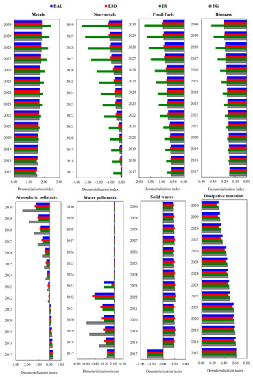 Figure 7 shows the simulation results of the dematerialization indexes of eight materials at resource end and discharge end under four scenarios. Compared with the BAU scenario, the dematerialization index of non-metals under the ESD scenario would decrease the most in the eight materials, with an average annual growth rate of 14.92% from 2017 to 2030, mainly owing to the large impact of the GDP growth reduction on the investment in the construction. Due to the technological progress brought by the investment in R&D and the increasing proportion of the tertiary industry, the IR scenario would enable non-metals, fossil fuels and biomass to reach the optimal dematerialization level under all four scenarios. Under the IR scenario, the consumption of metals, non-metals, fossil fuels and biomass in 2030 would be reduced by 70.43%, 32.57% and 3.58%, respectively, compared with the BAU scenario, while the GDP growth rate would be relatively stable in this scenario, no more than 6.80% during 2016–2030, which would significantly increase the dematerialization level. Compared with the BAU scenario, the dematerialization index value of non-metals, fossil fuels and biomass would decrease by 293.84%, 57.21% and 24.39% respectively under the IR scenario. The EG scenario would improve the dematerialization level of atmospheric pollutants most significantly. From 2017 to 2030, the dematerialization index value would change from 0.28 (weak decoupling) to −2.39 (strong decoupling) mainly due to the fact that water pollutants and dissipative materials have reached an ideal strong decoupling state in 2016, which means the potential for dematerialization has become very limited since then. At that time, atmospheric pollutants were still at the weak decoupling level. The environmental governance investment could improve the treatment capacity of atmospheric pollutants, thereby reducing emissions of atmospheric pollutants. From 2017 to 2030, increasing environmental governance investment would increase the average annual growth rate of industrial atmospheric pollutants treatment capacity by 131.23% relative to the BAU scenario. As a result, significant reductions in emissions would occur as the investment in environmental governance increase, which would show significant dematerialization. The best dematerialization scenarios for eight materials during 2017–2030 can be found in Supplementary Information F.