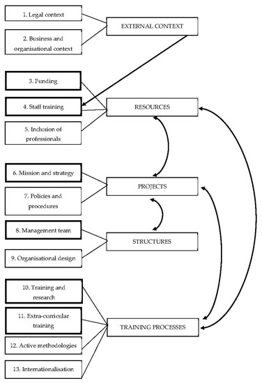 In short, Training-related factors showed the highest and most numerous correlations among all the factors. Despite this, they revealed low or no correlations with external contextual factors. In contrast, these factors were found to have the highest correlations with resource-related factors, which were lower and less frequent for other factors; and with structural factors, the most significant being the relationships between training for faculty staff and support from the management team with both curricular and extra-curricular training. Both of these tended to have the highest correlation with the other factors and therefore were the most sensitive to the influence of the remaining factors.