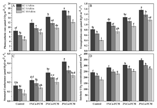 The effect of calcium-fortified composted manure on physiological parameters, photosynthetic rate (A), transpiration rate (B), stomatal conductance (C) and intrinsic CO2 concentration (D) of canola under saline soils. Quantities sharing similar letters are not significantly different from each other at p ≤ 0.05. Data are mean of three replicates ± SD. Ca-FCM, calcium-fortified composted animal manure.
