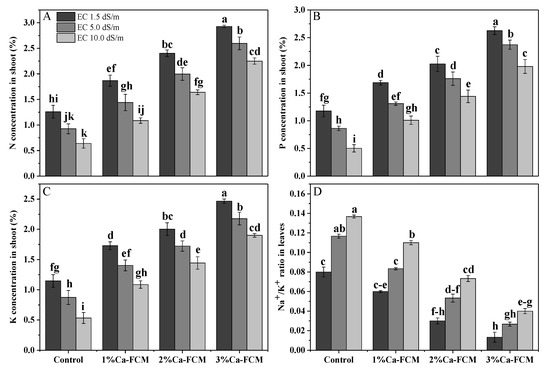 While it is well established that higher levels of Na+ ions hinder uptake of other essential key nutrients by plants [89], the current findings reveal that the application of Ca-FCM prominently increased the concentrations of essential plant nutrients. This agrees with previous studies that organic amendments enhance the availability of essential nutrients [90,91]. In the present study, especially the application of 3% Ca-FCM significantly enhanced nitrogen, phosphorus, and potassium concentrations in shoot under normal as well as saline soil conditions. These results are substantiated with Erdal et al. [92], who described that accumulation of nutrients in plants were boosted by using mixture of chemical and organic fertilizers. In addition, nitrogen and phosphorus concentrations in plants were improved with the application of rock phosphate mixed with organic fertilizers [93,94]. In the current study, maximum Na+ concentration was observed in control (no-amendment) and minimum concentration was found in Ca-FCM at the rate of 3% at all salinity levels. These results are in line with Shahzad et al. [64], who found increasing Na+ concentrations in plant tissues with the increase in salinity levels. The increased Na+ concentration in different plant parts (root, shoot, and grains) in control plants might be associated with the increased Na+ ions in soil and rooting medium [95]. Moreover, maximum K+ was found in plants treated with Ca-FCM in normal as well as in salt-stressed soil. This might be due to the applied composted manure that increased the cation exchange capacity (CEC) of the soils, which in turn limited the entry of Na+ on exchange sites leading to increased K+ for plant uptake [33,71].