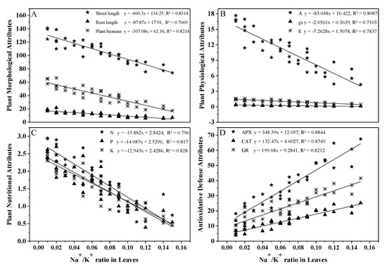 Regression relationship among Na+/K+ ratio in leaves and plant morphological (A), physiological (B), nutritional parameters (C), and antioxidant defense attributes (D) of canola under saline soil conditions. A, photosynthetic rate; E, transpiration rate; gs, stomatal conductance.